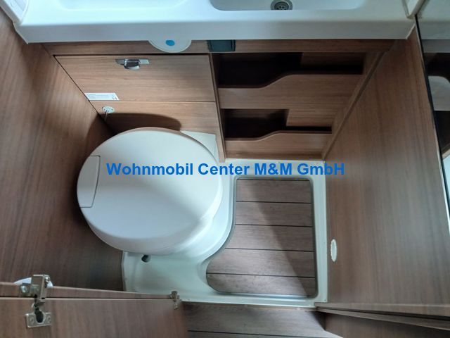 • Toiletten-/Duschraum mit Waschtisch, Kassetten-Toilette, Schiebespiegel und Ablagefächer
