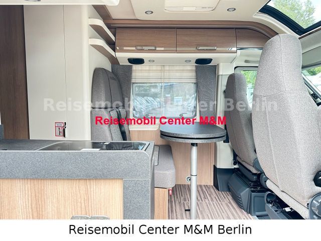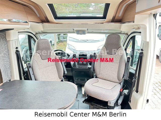 Sonderausstattung: Chassis Paket, bestehend aus: Fahrerhausverdunklungssystem Plissee an Front- und Seitenscheiben, Fliegenschutzgitter hinter Schiebetür, Außenspiegel, elektrisch verstell- und beheizbar, Beifahrersitz höhenverstellbar, Pilotensitze in Wohnraumstoff bezogen inkl. gepolsterten Armlehnen, Radiovorbereitung mit Dachantenne und DAB+, Lautsprecher (4x), Armaturenbrettveredelung: Lüftungsgitter in Chrom, Kraftstofftank 90 Liter, Ladebooster, Einparkhilfe mit Sensoren am Heck Paket Aufbau, bestehend aus: Verzurrsystem Gepäckraum, Upgrade Küchencenter, Truma CP Plus digitales Bedienpanel, Dachinnenverkleidung mit Mikrofaser-Klimabelag, Abwassertank in Gehäuse eingefasst und isoliert, Qualitäts-Kaltschaummatratze im Heckbett, Deckenbaldachin Wohnraum mit indirekter LED-Ambientebeleuchtung PREMIUM-FENSTER im Waschraum Navigationssystem Markise Stilwelt Cherry Classic: Möbeloberlfäche in Bicolor-Optik in Dekor Edelkirsche, Dachschrankboden in Elfenbein matt London - Stoff-Kombination Charming Serienausstattung im ''GT skyview'' enthalten: Erweitertes Außendekor mit Weltkugelsymbol und Schriftzug ?charming? Lenkrad und Schaltknauf in Leder 16'' Alufelgen Fiat Ducato Kühlergrill in Hochglanz schwarz Scheinwerferrahmen in schwarz Stoßfänger in Wagenfarbe lackiert Zusätzliches Ablagefach am Dachstauschrank im Eingangsbereich über der Küche Upgrade LED-Ambientebeleuchtung: Indirekte Ambientebeleuchtung auf Fahrer- und Beifahrerseite, LED-Ambientebeleuchtung am Doppelboden der Wohnsitzgruppe Technikblende über Bedienpanel im Eingangsbereich